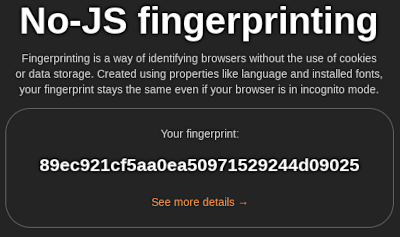 No-JS Fingerprint demonstriert, dass man einen Fingerprint mit CSS statt Javascript berechnen kann. Allerdings wird nicht demonstriert, dass dieser Fingerprint individuell genug ist, um einzelne Surfer zu verfolgen. (Die JS-Fingerprint Demo der gleichen Firma ist da anschaulicher.)